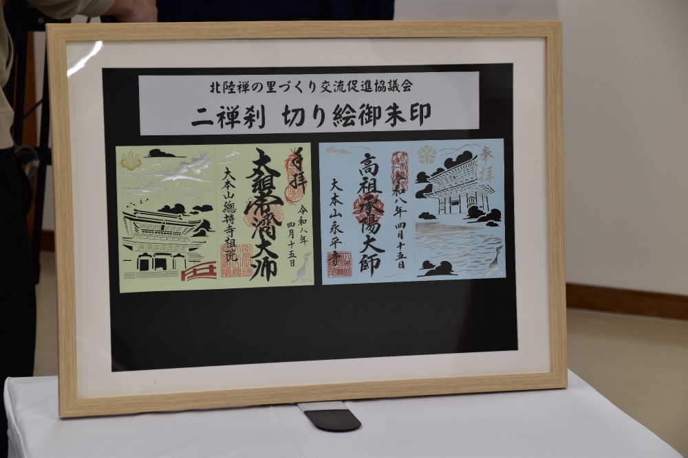 禅文化の広がりを水にたとえ、九頭竜川(永平寺)から日本海(總持寺)に広がる“禅の水”をイメージした台紙になっております。
